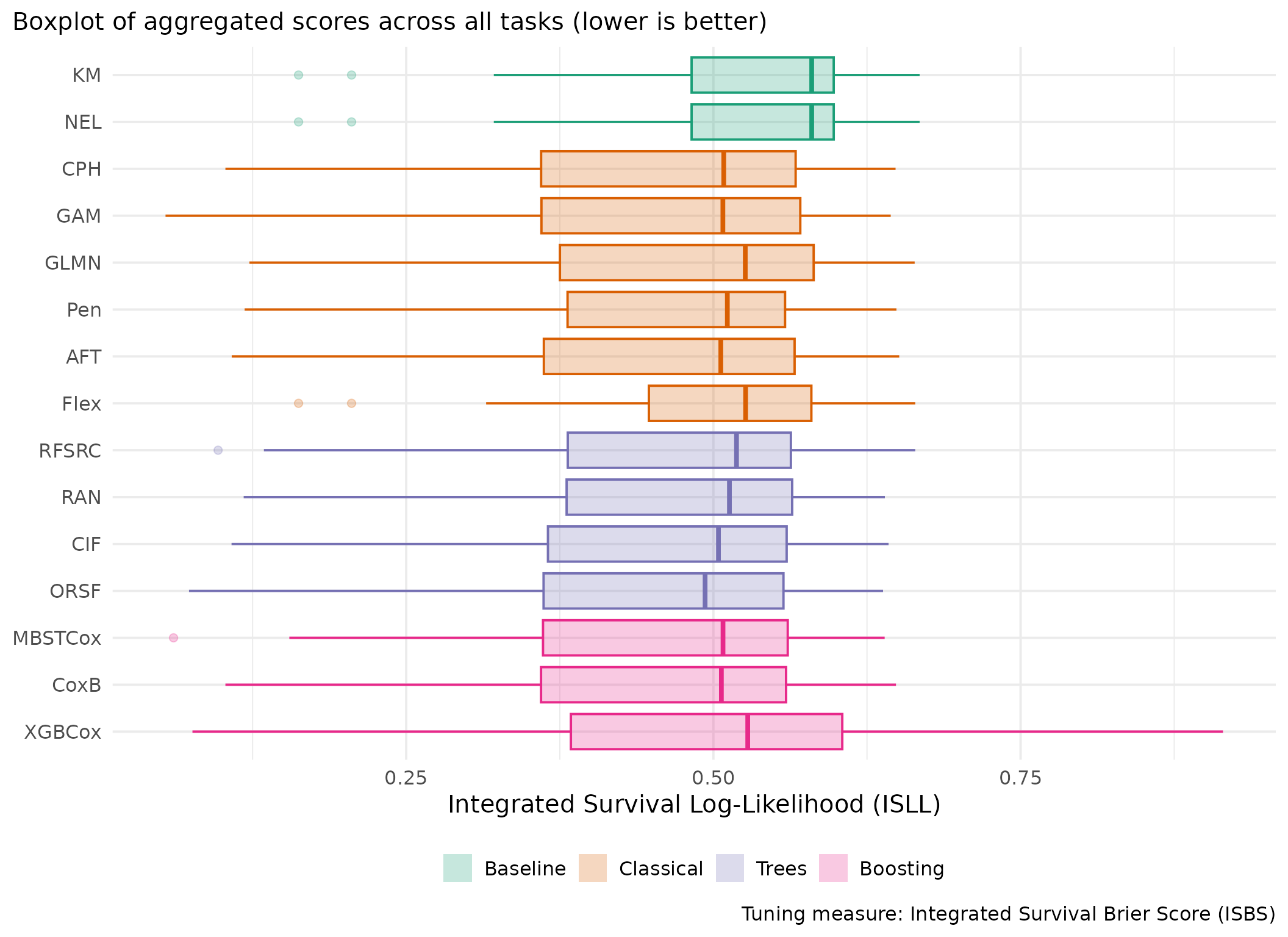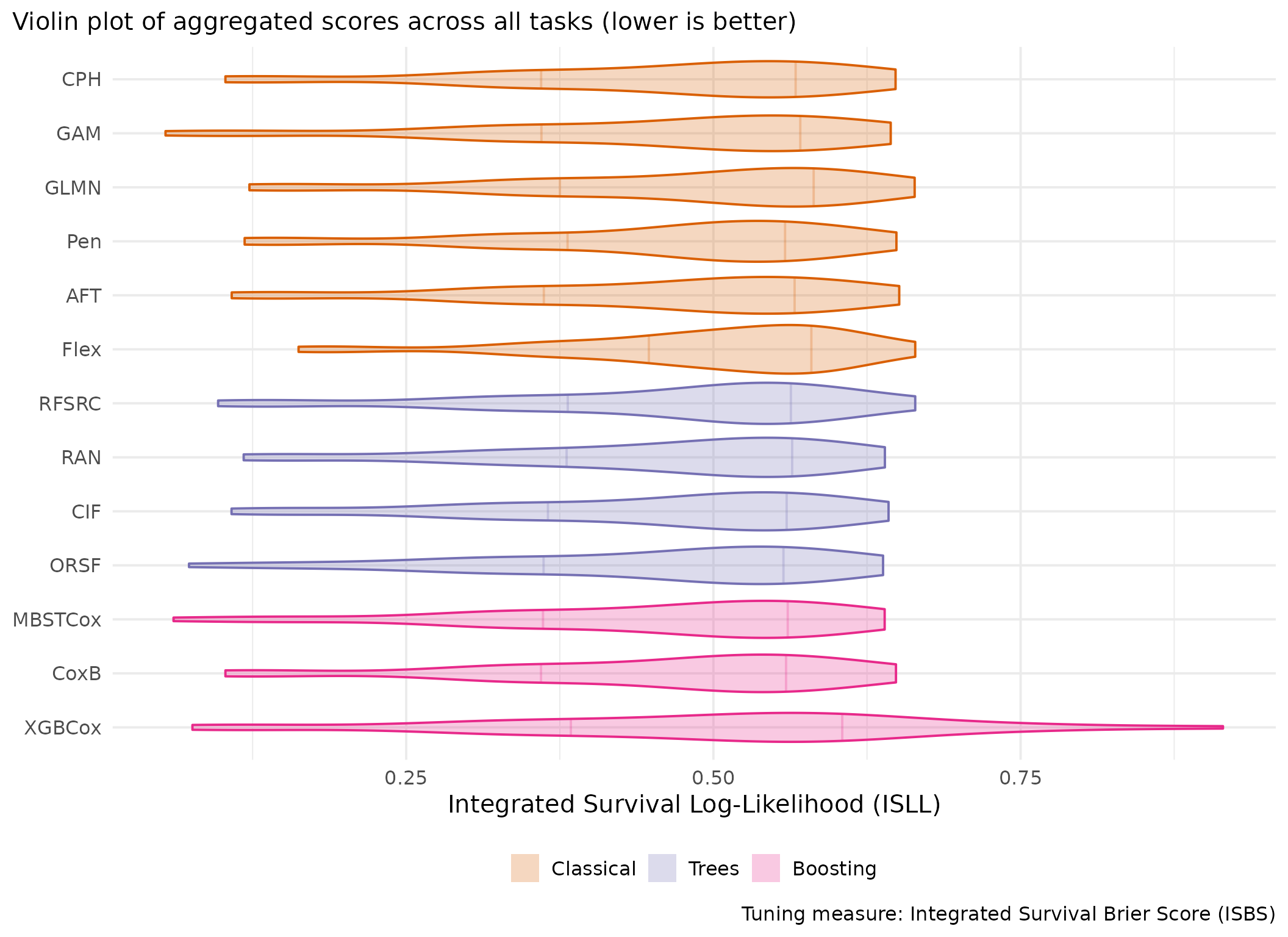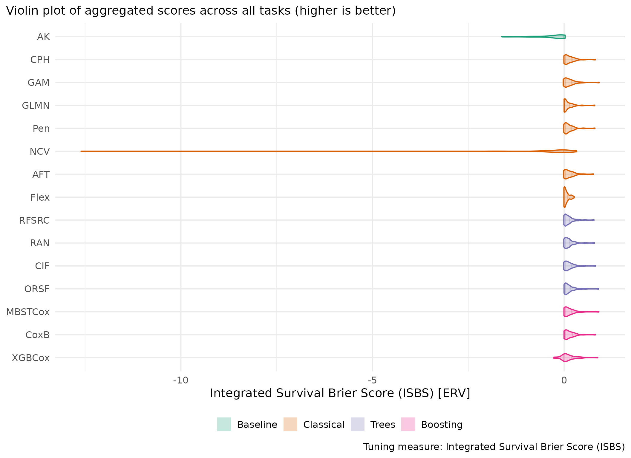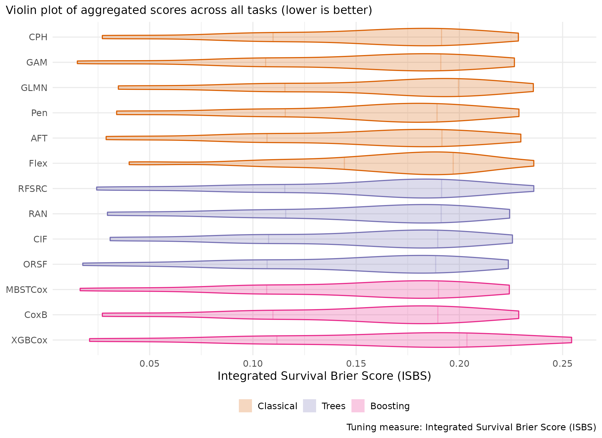 This page presents aggregated benchmark results, including statistical tests and critical difference plots. Results are divided by tuning measure: harrell_c (discrimination) and isbs (proper scoring rule).