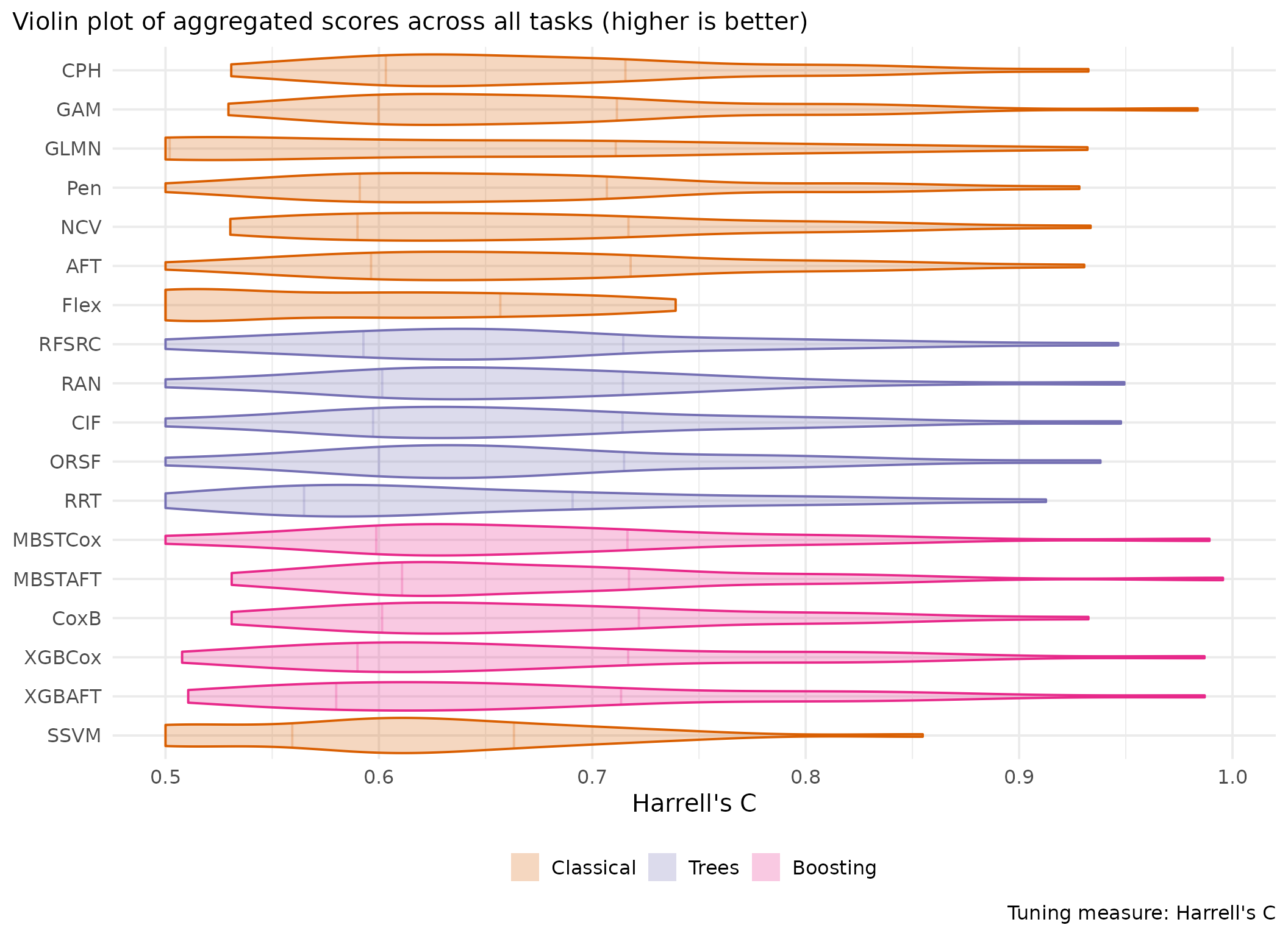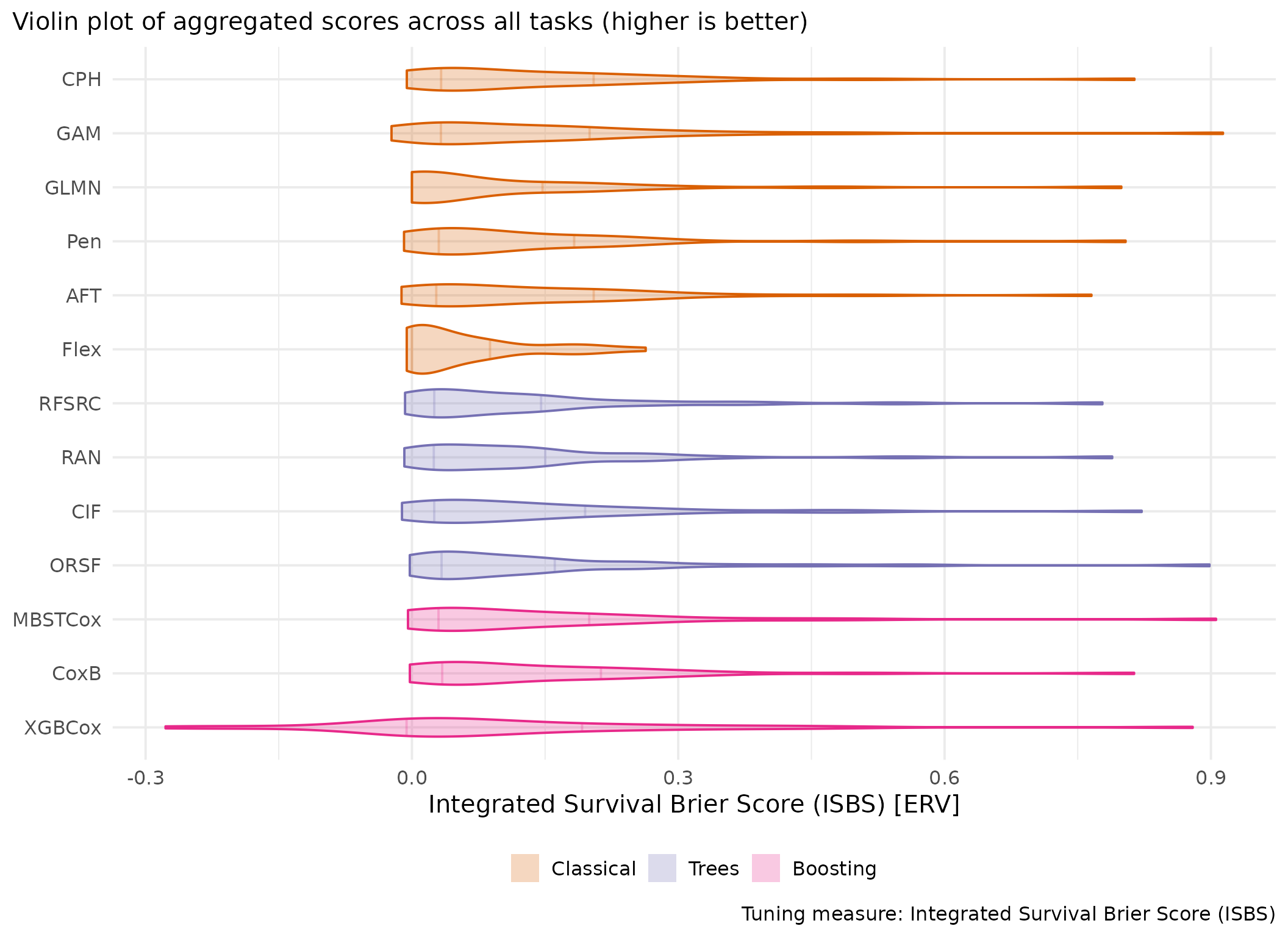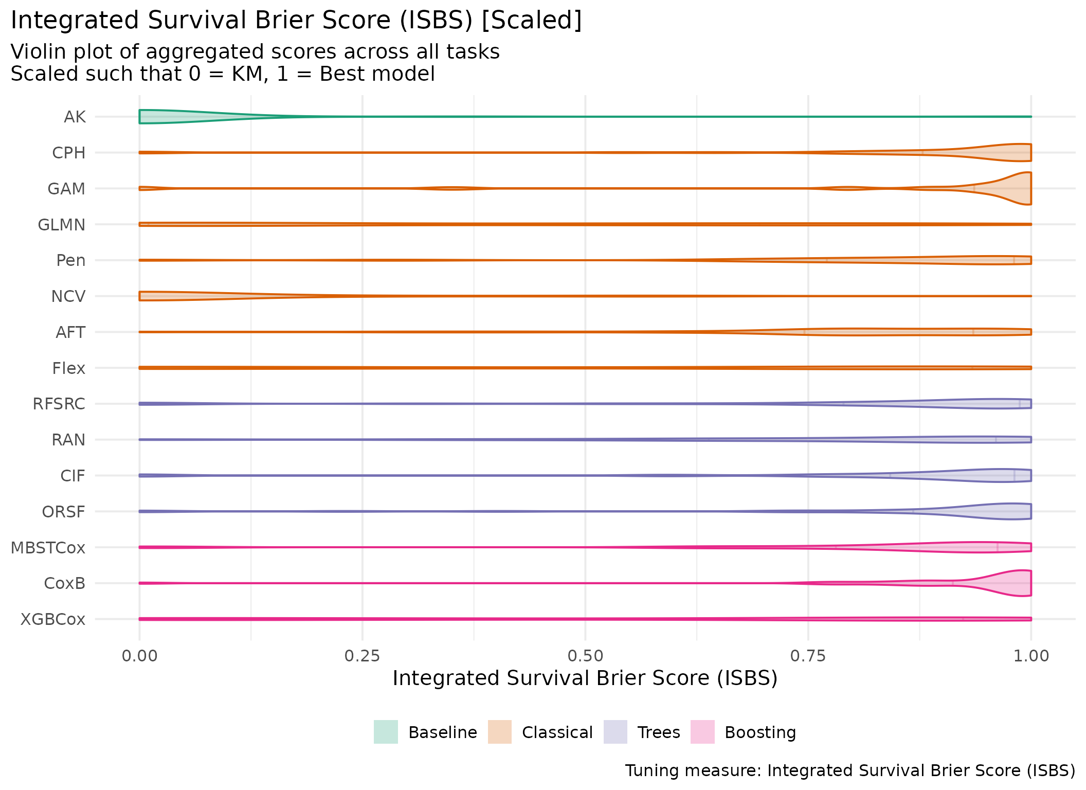 This page presents aggregated benchmark results, including statistical tests and critical difference plots. Results are divided by tuning measure: harrell_c (discrimination) and isbs (proper scoring rule).