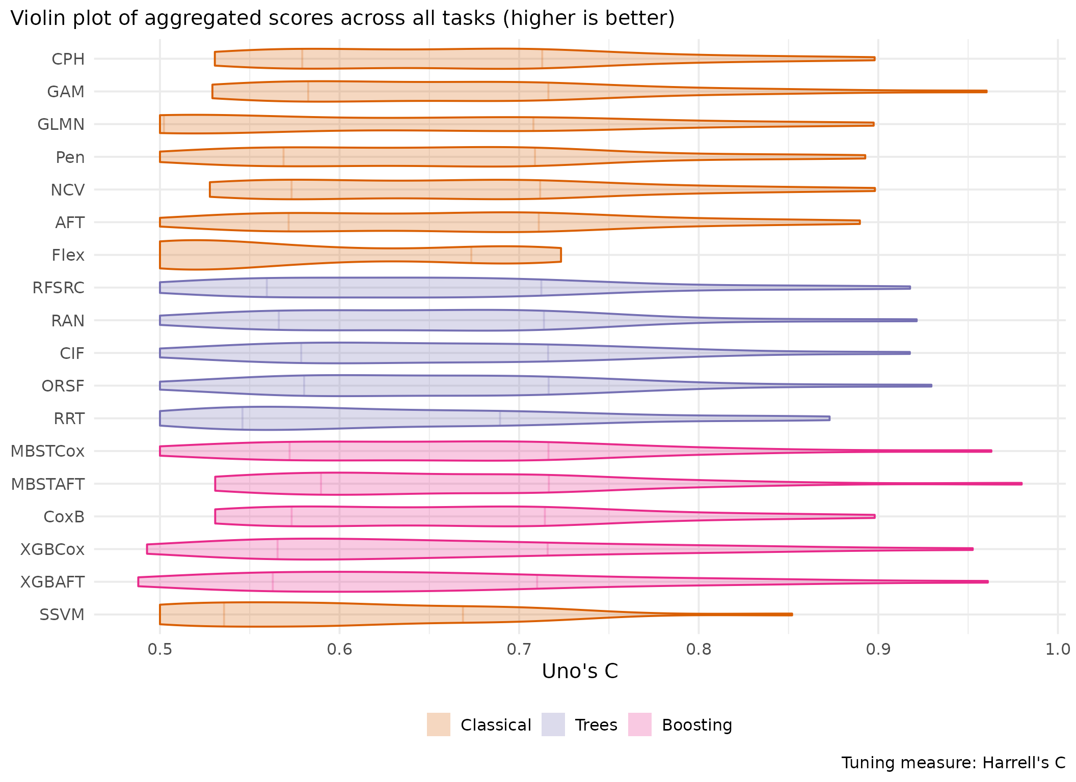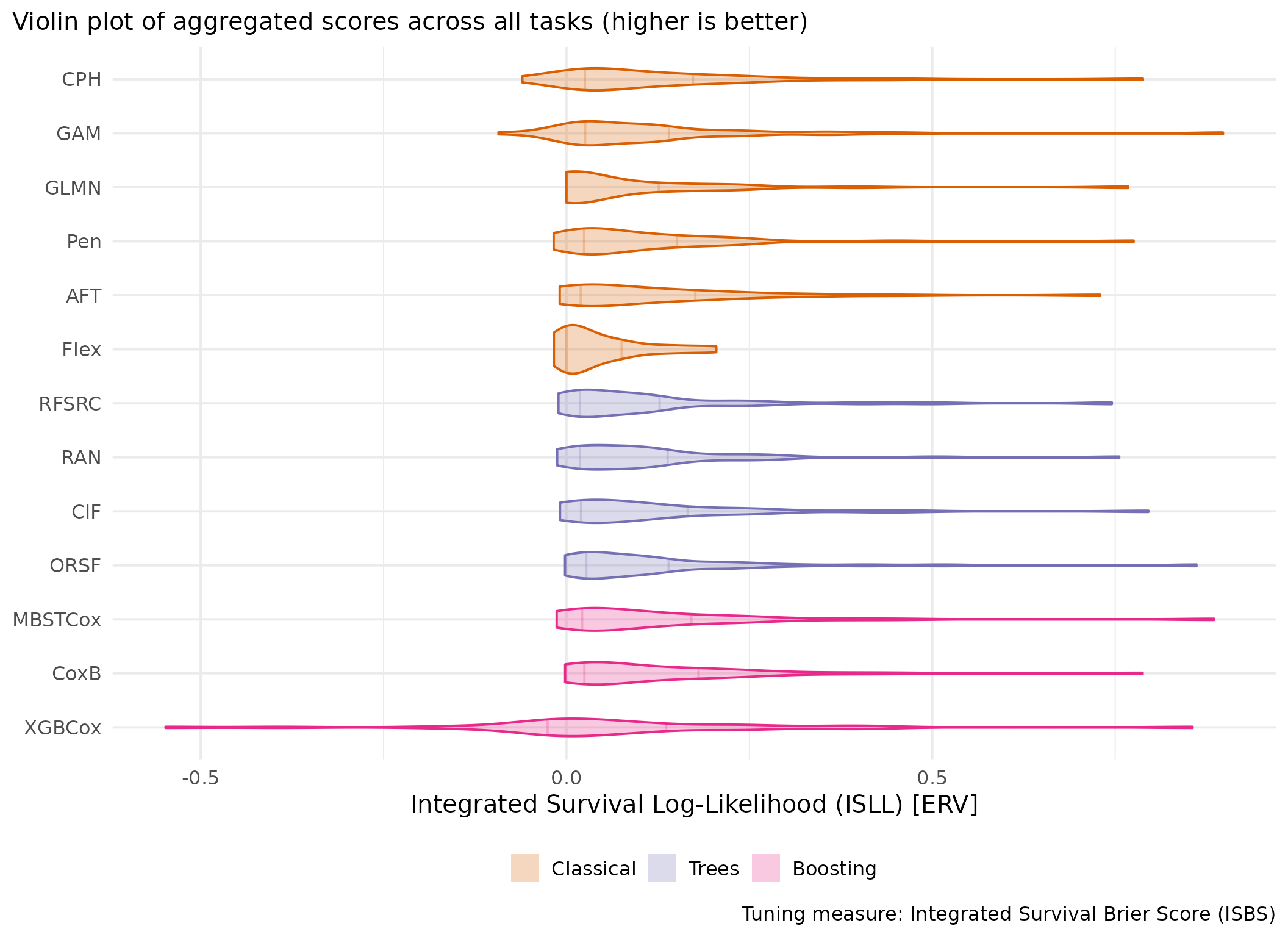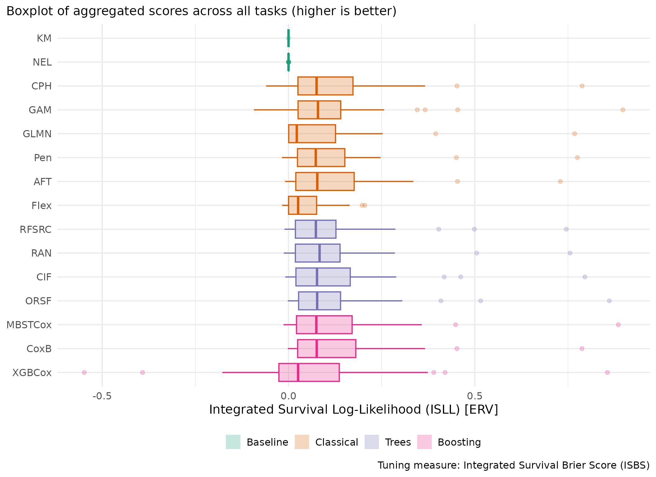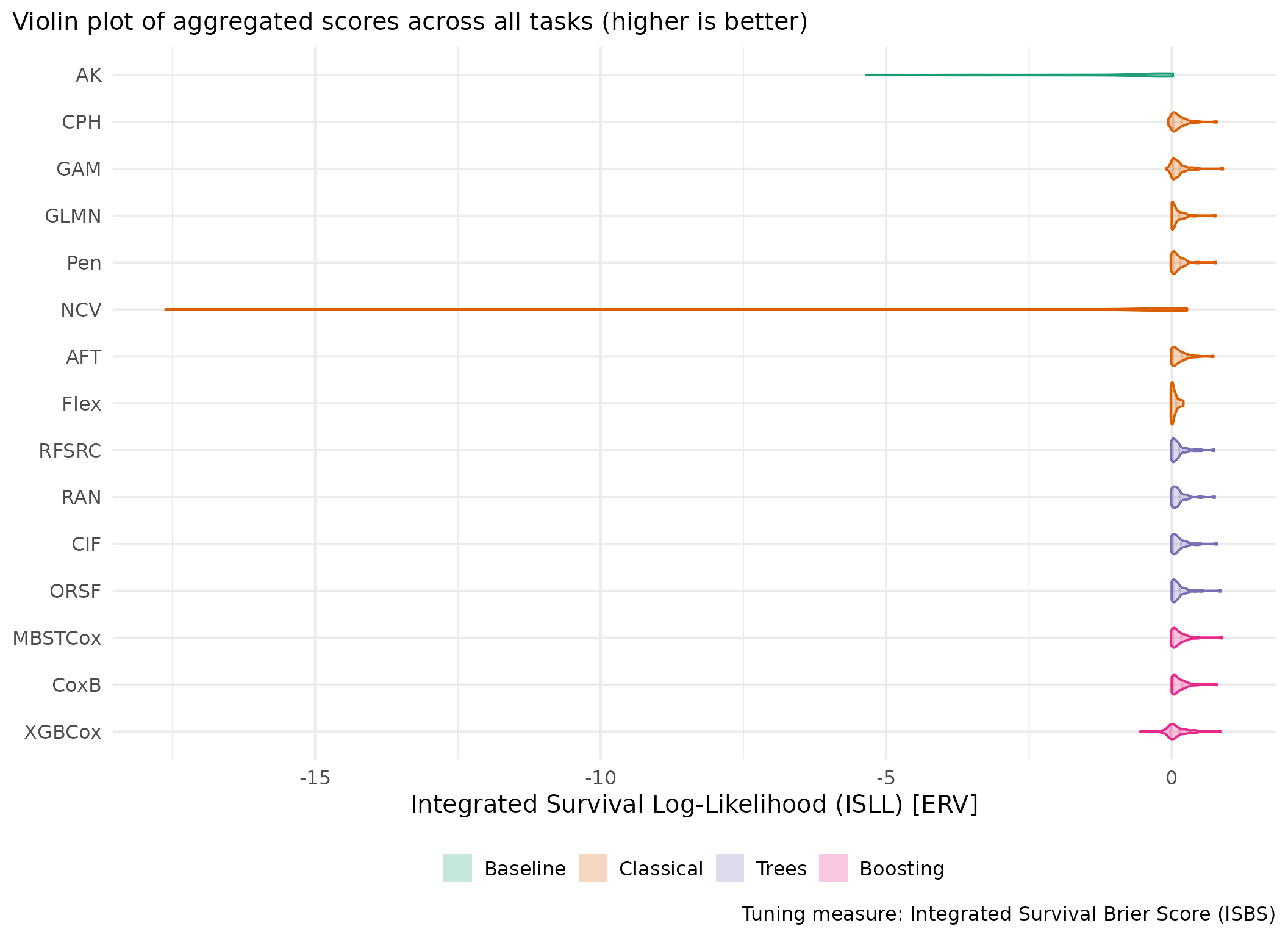 This page presents aggregated benchmark results, including statistical tests and critical difference plots. Results are divided by tuning measure: harrell_c (discrimination) and isbs (proper scoring rule).