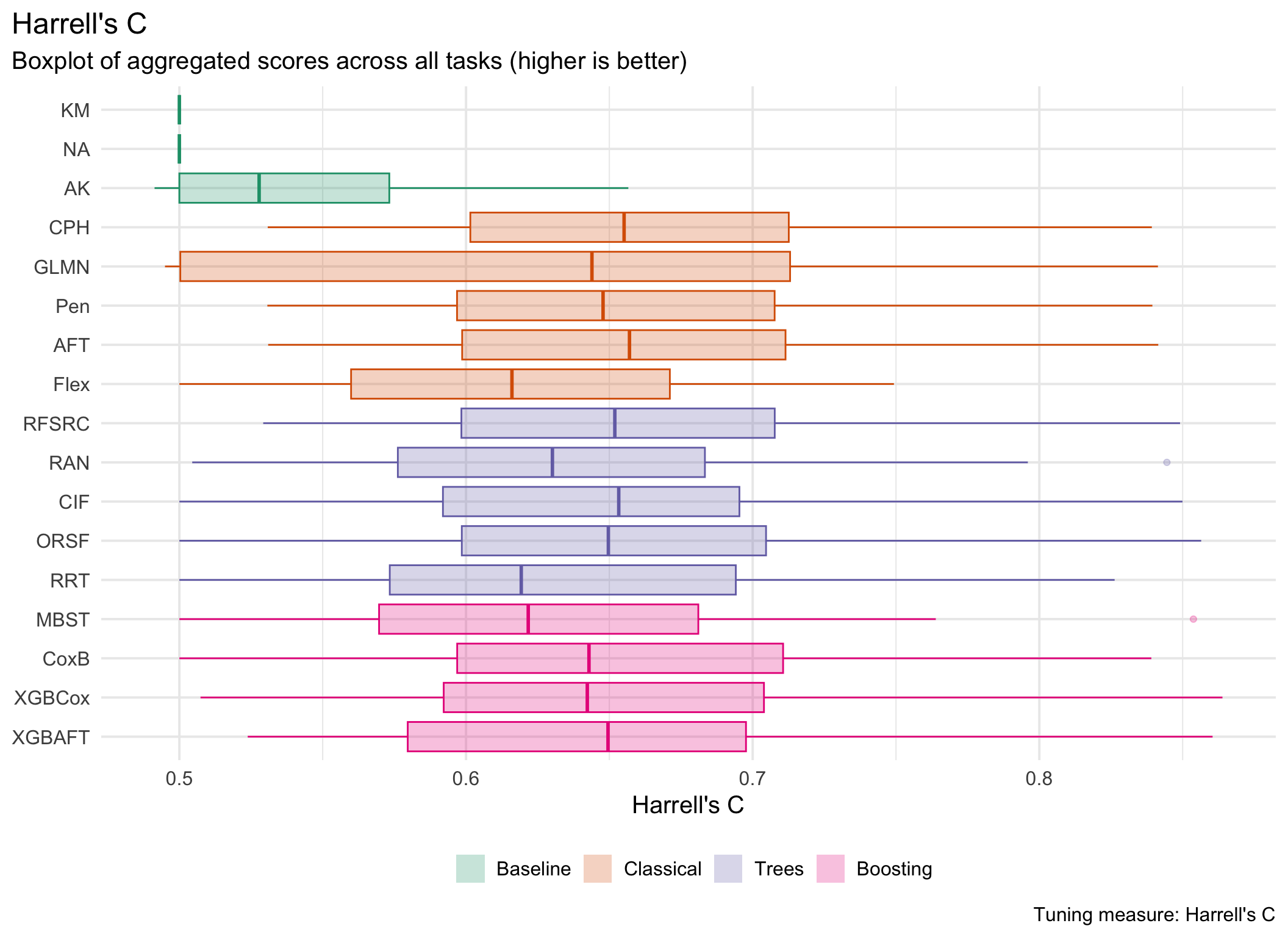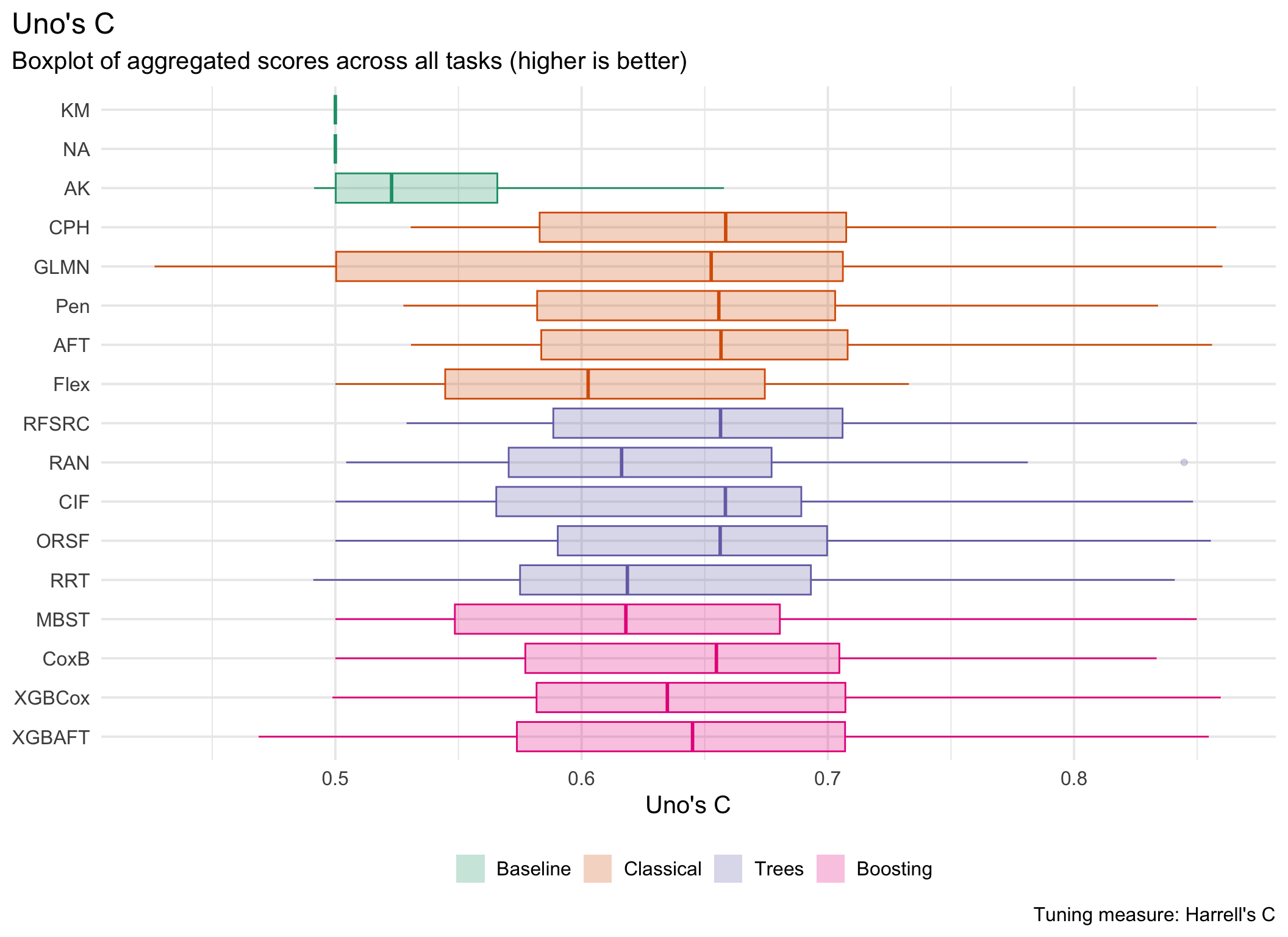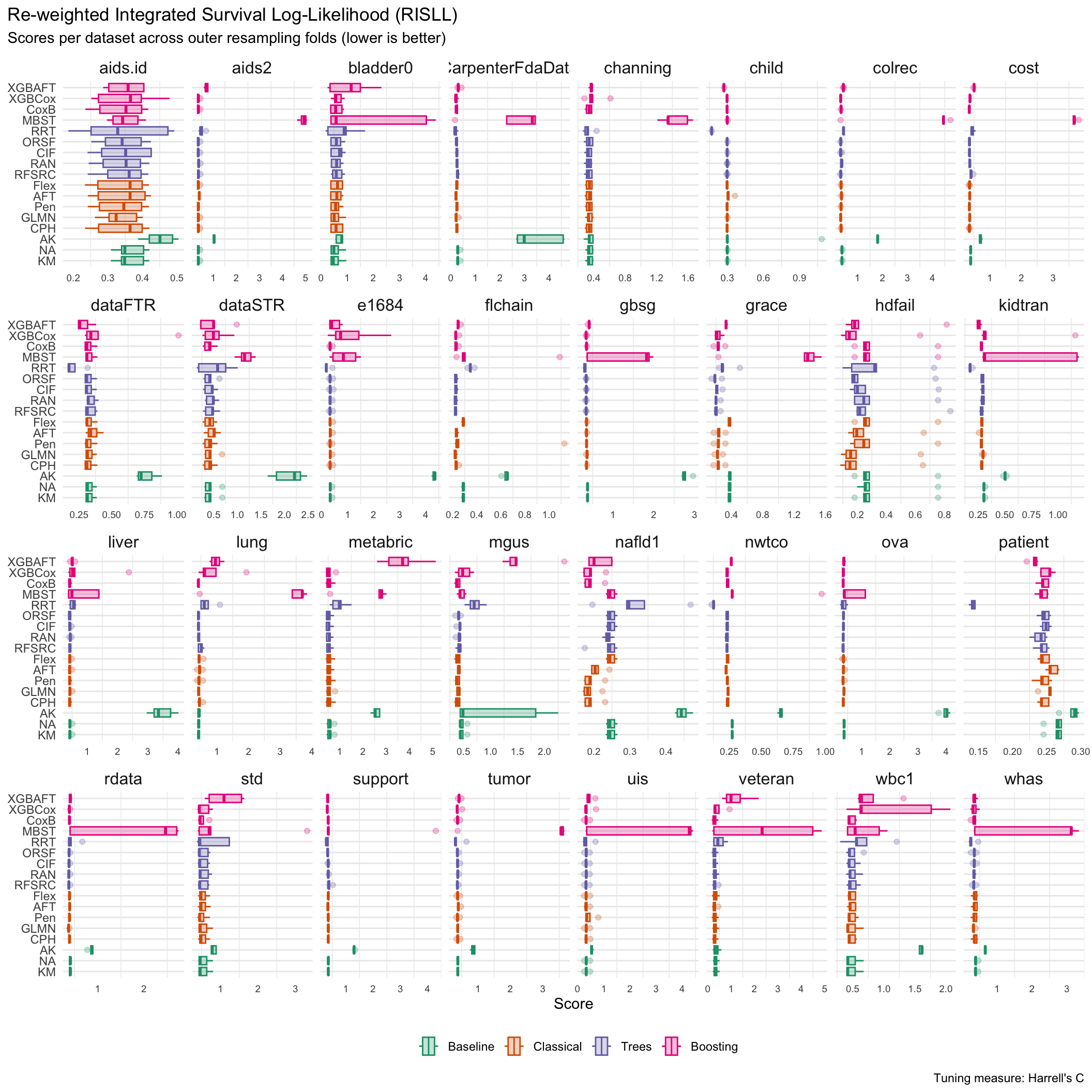 In general, results are divided by underlying tuning measure, i.e. harrel_c and rcll, with the former being a measure of discrimination and the latter a proper scoring rule.