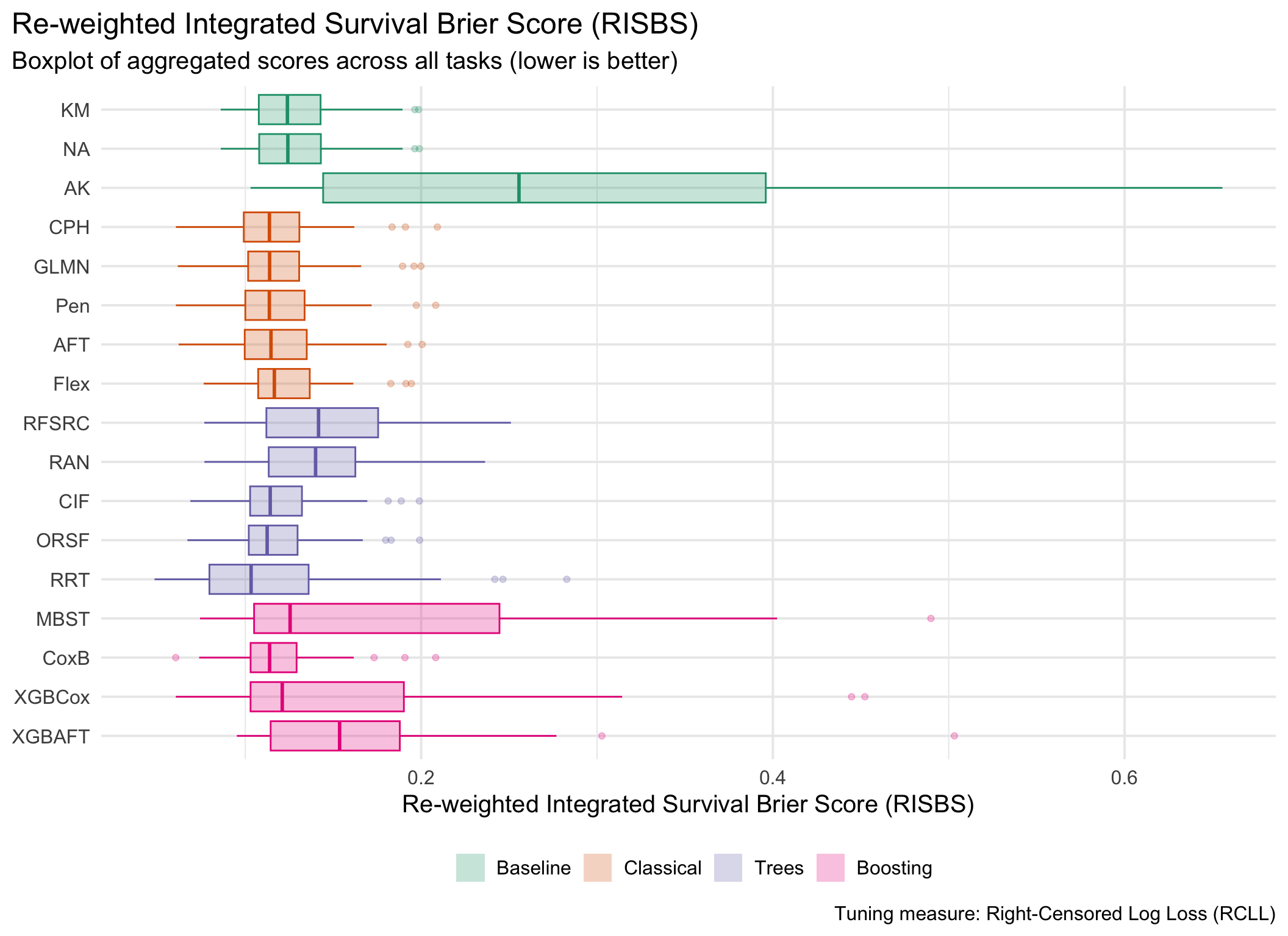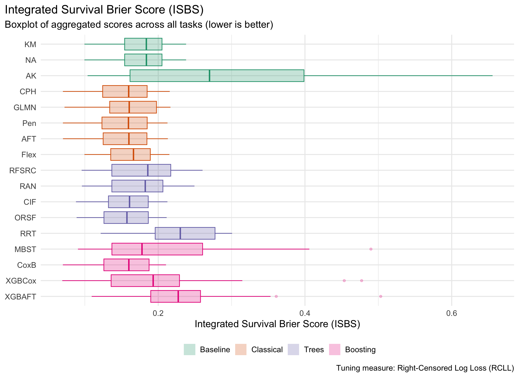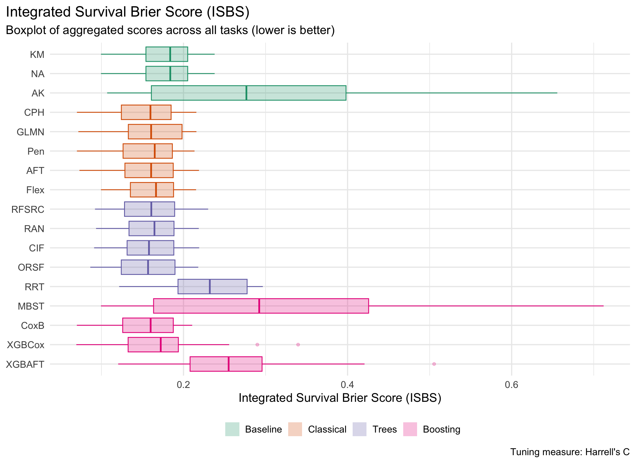 In general, results are divided by underlying tuning measure, i.e. harrel_c and rcll, with the former being a measure of discrimination and the latter a proper scoring rule.