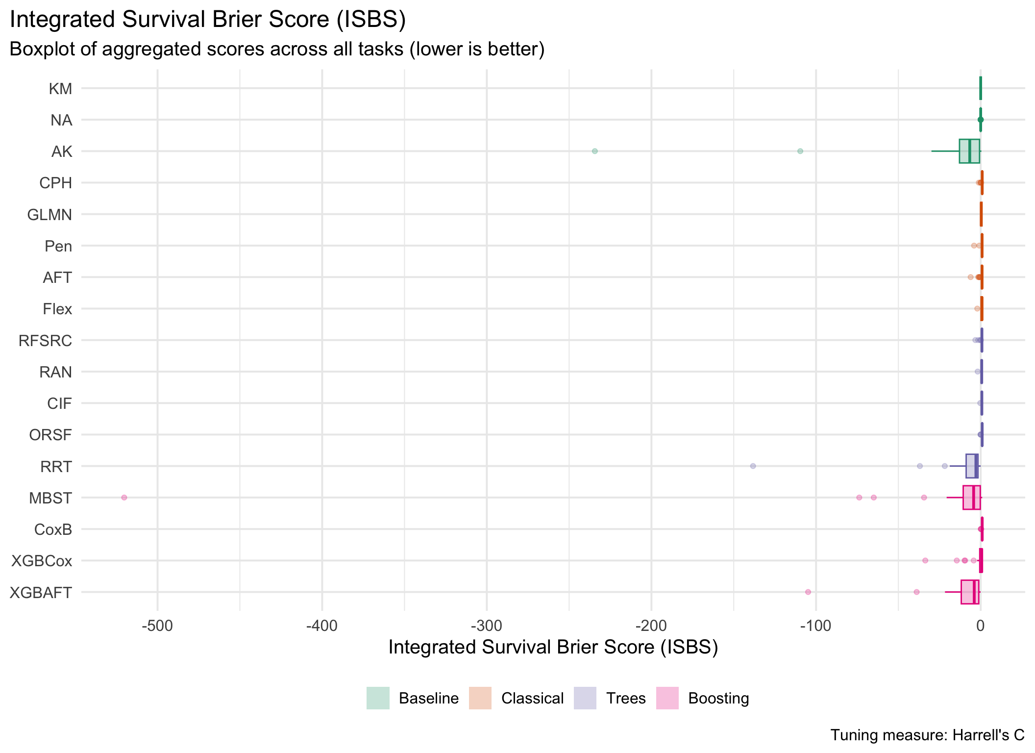 for (measure_id in msr_tbl[(id =="brier_improper"| type =="Discrimination") &!erv, id]) {plot_aggr_scores(aggr_scores, type ="box", eval_measure_id = measure_id, tuning_measure_id ="harrell_c", dodge =FALSE, flip =TRUE)}