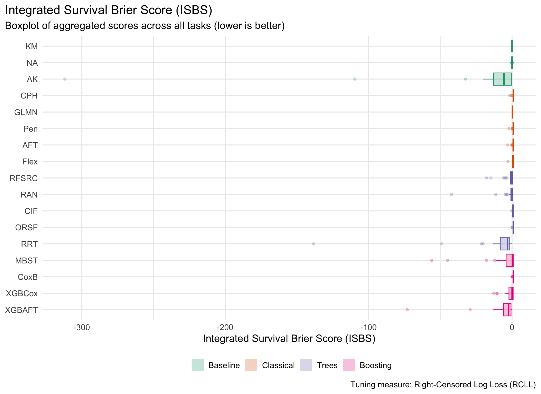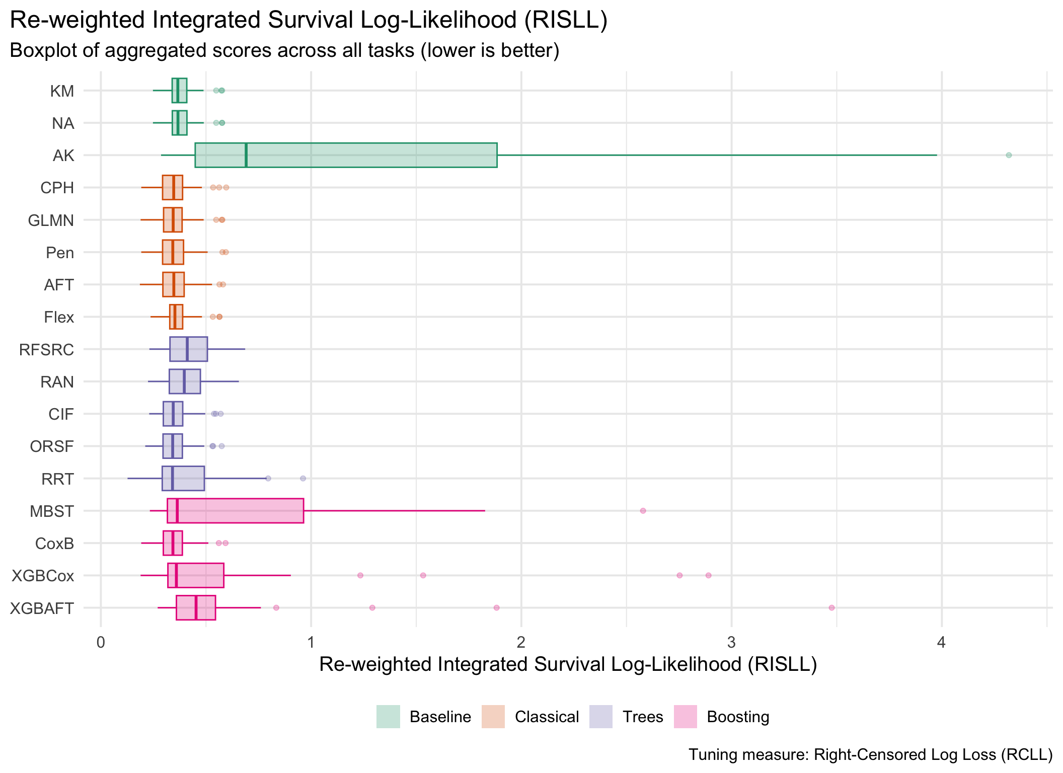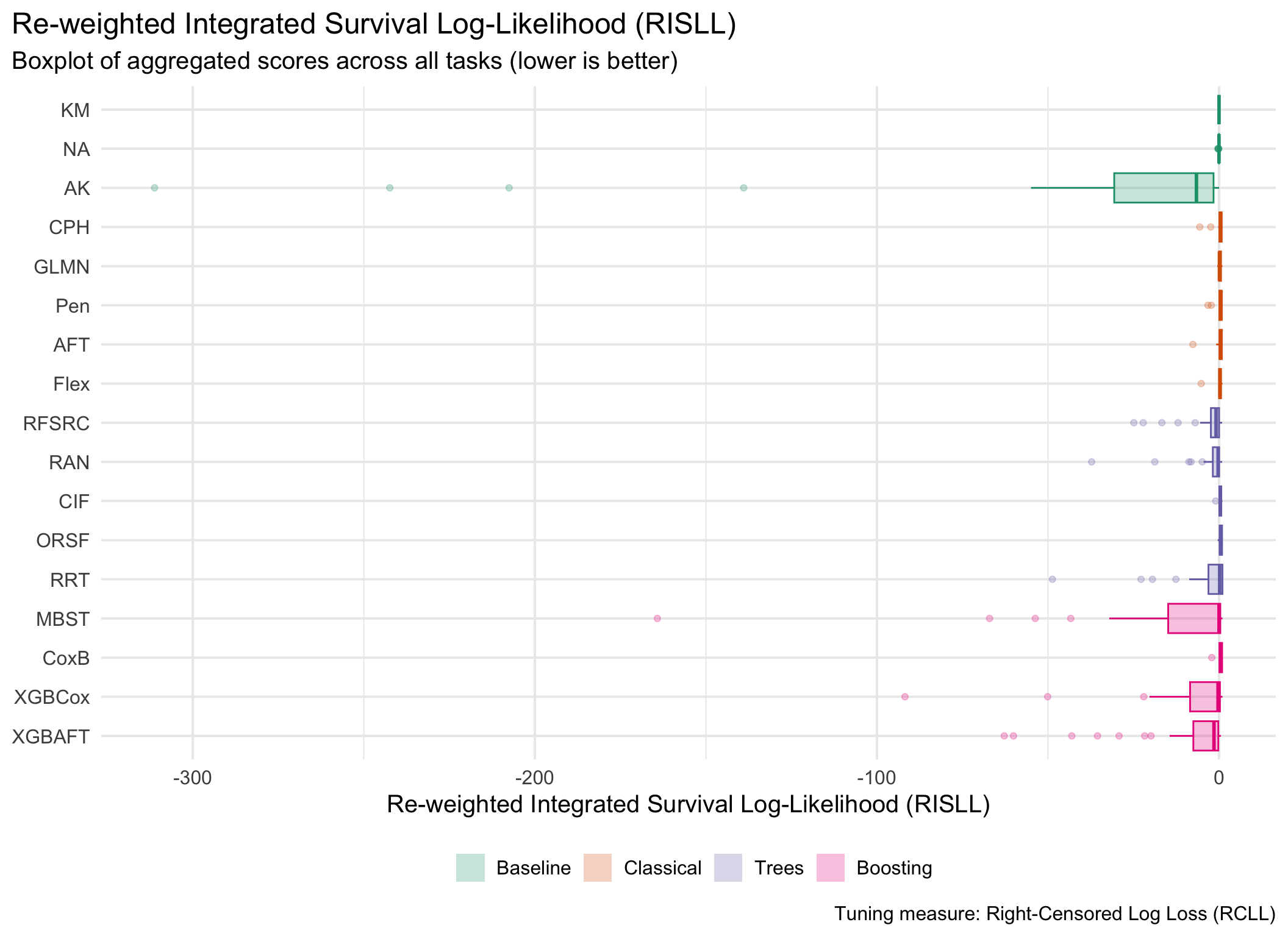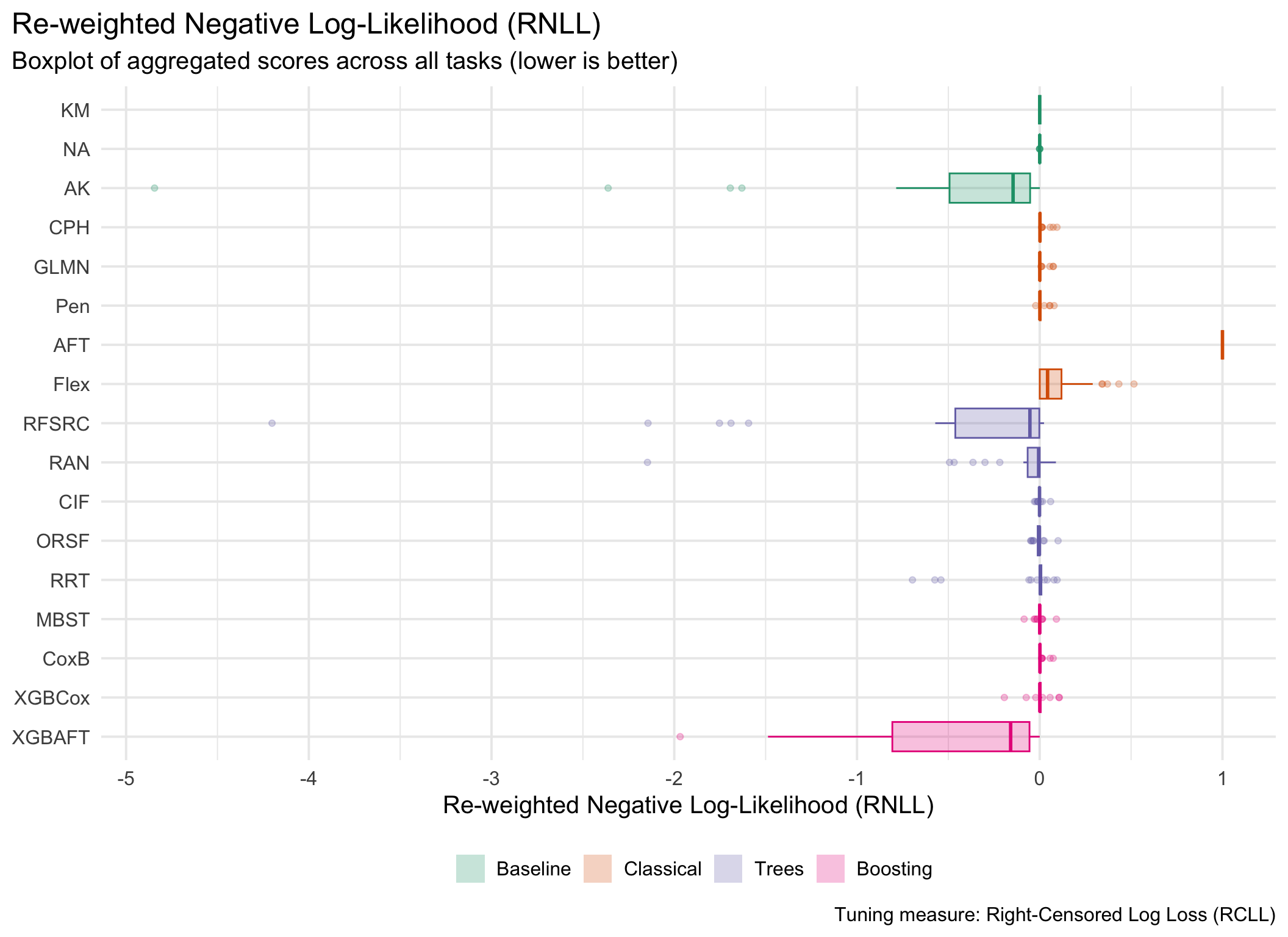 for (measure_id in msr_tbl[type =="Scoring Rule"& erv, id]) {plot_aggr_scores(aggr_scores, type ="box", eval_measure_id = measure_id, tuning_measure_id ="rcll", dodge =FALSE, flip =TRUE)}