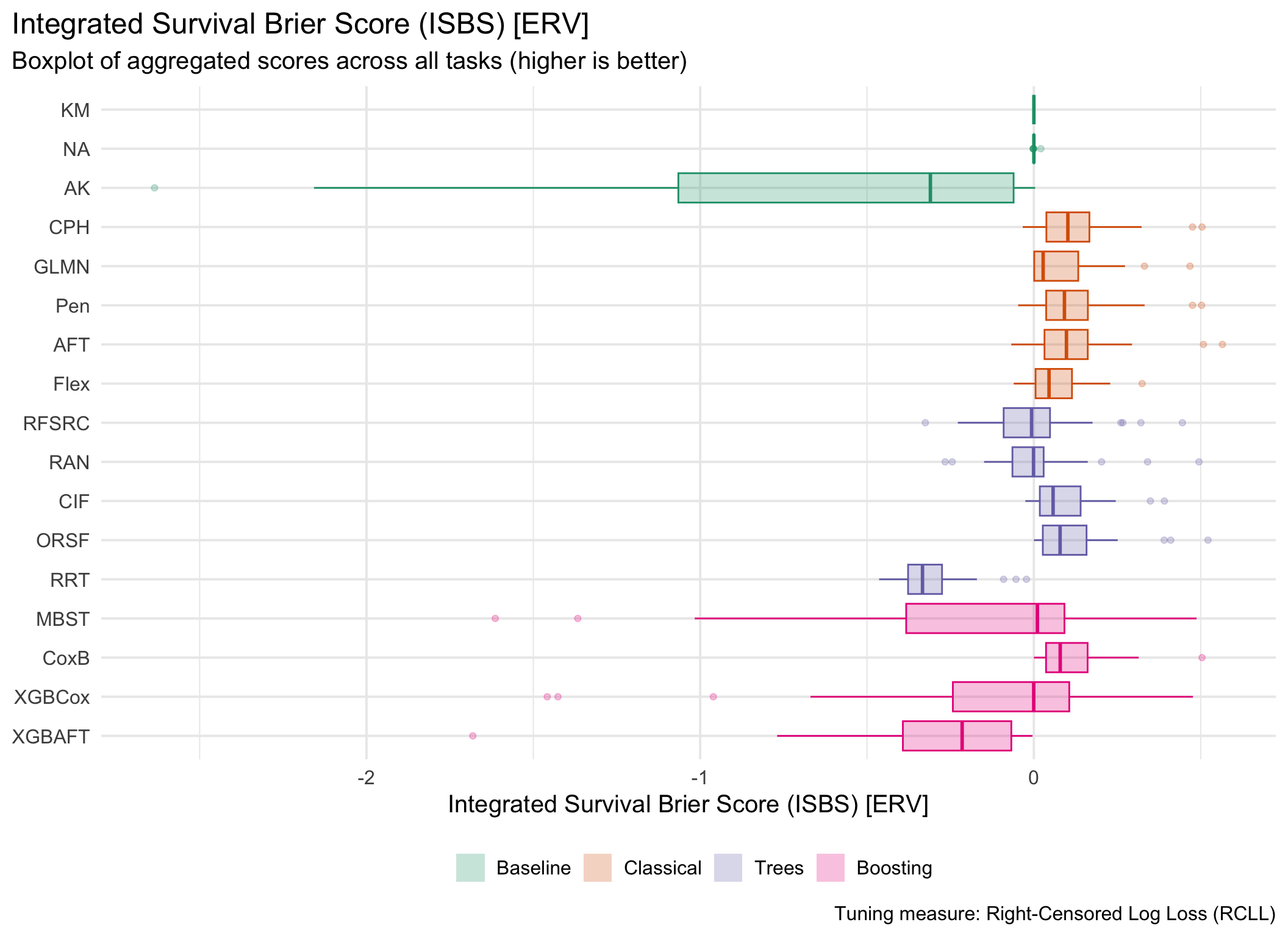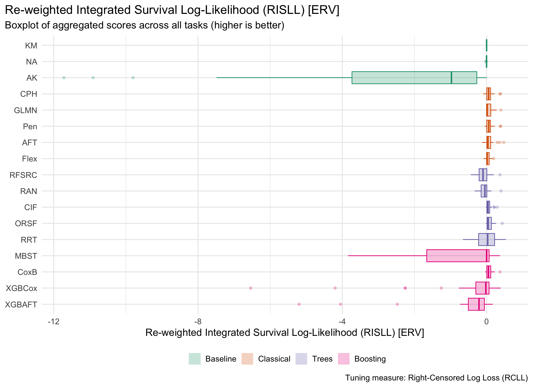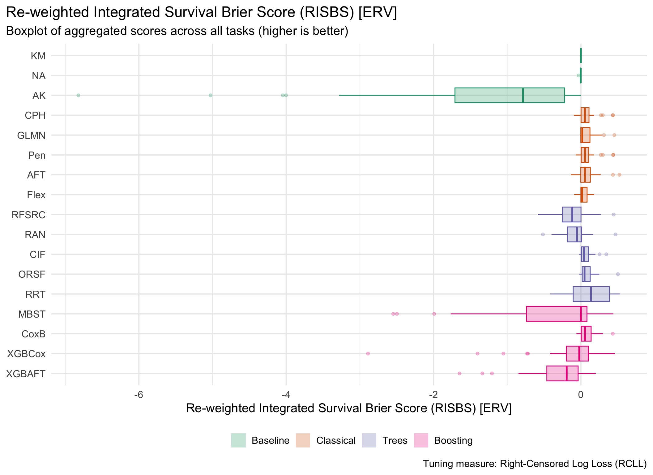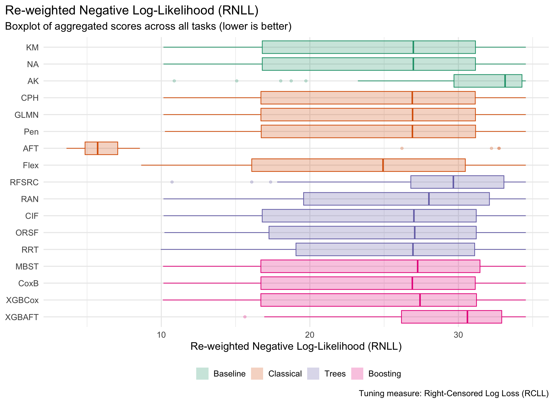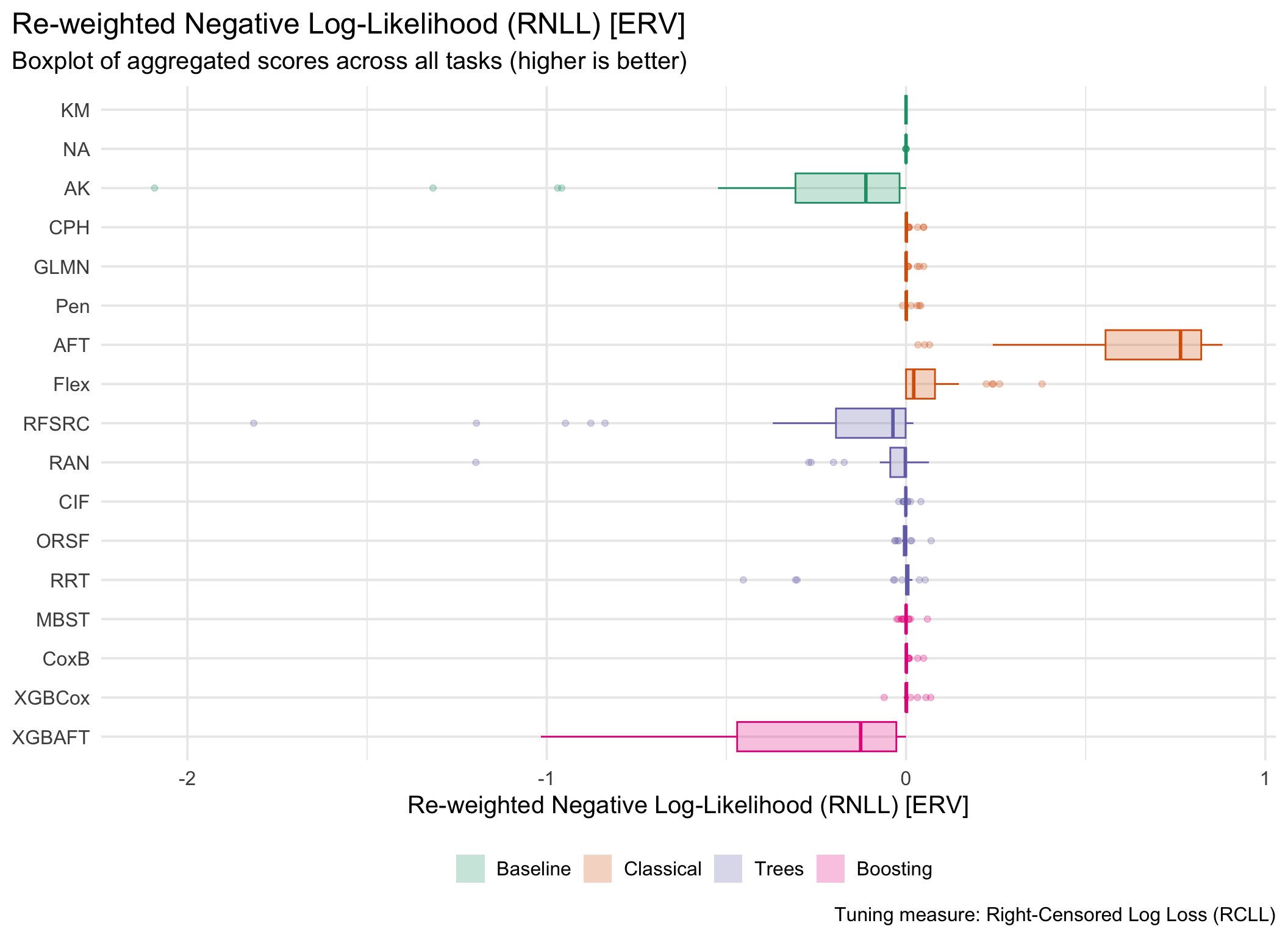 for (measure_id in msr_tbl[type =="Scoring Rule"& erv, id]) {plot_aggr_scores(aggr_scores, type ="box", eval_measure_id = measure_id, tuning_measure_id ="rcll", dodge =FALSE, flip =TRUE)}
