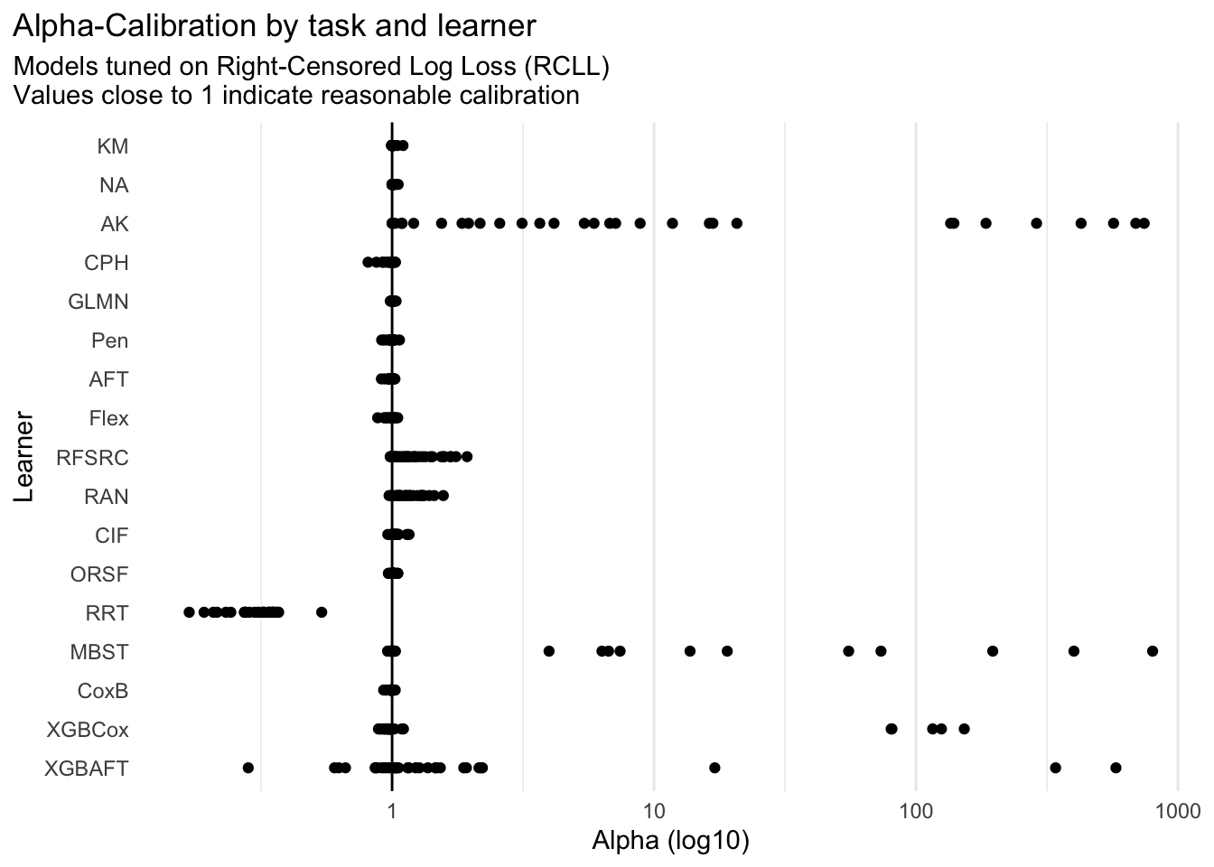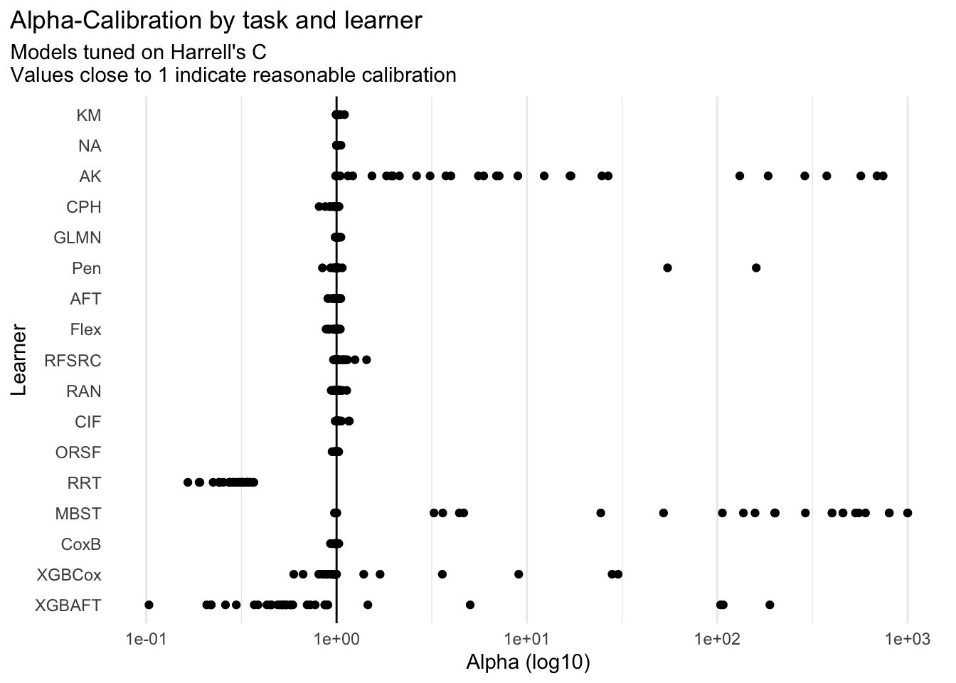 for (tuned_on inc("harrell_c", "rcll")) { p =ggplot(aggr_scores[tuned == tuned_on], aes(y = forcats::fct_rev(learner_id), x = caliba_ratio)) +geom_point() +geom_vline(xintercept =1) +scale_x_log10() +labs(title ="Alpha-Calibration by task and learner",subtitle = glue::glue("Models tuned on {msr_tbl[id == tuned_on, label]}\n","Values close to 1 indicate reasonable calibration" ),y ="Learner", x ="Alpha (log10)" ) +theme_minimal() +theme(legend.position ="bottom",plot.title.position ="plot",panel.grid.major.y =element_blank(),panel.grid.minor.y =element_blank()# panel.spacing.x = unit(5, "mm"),# panel.background = element_rect(fill = "#EEEEEE", color = "#EEEEEE") )print(p)}
