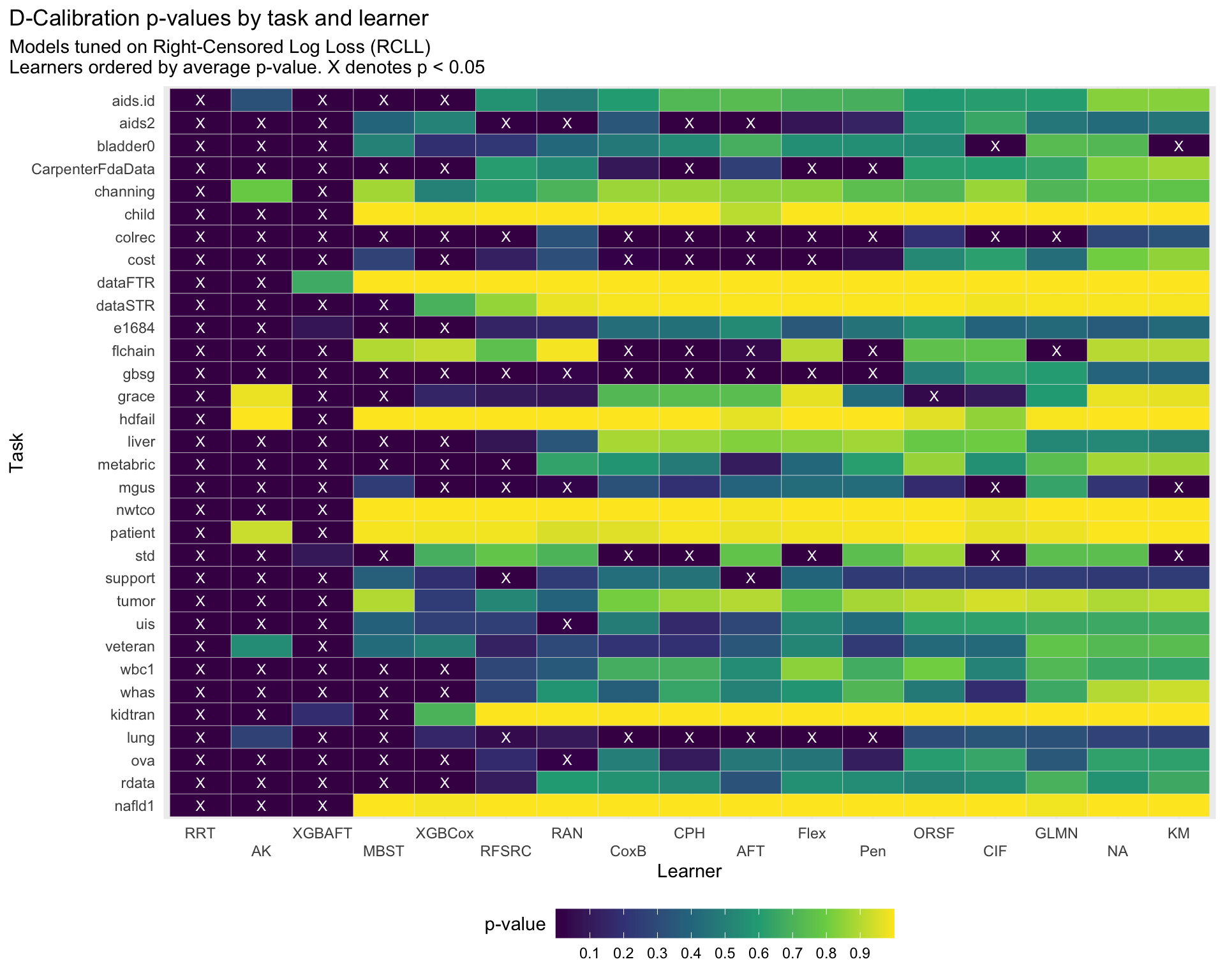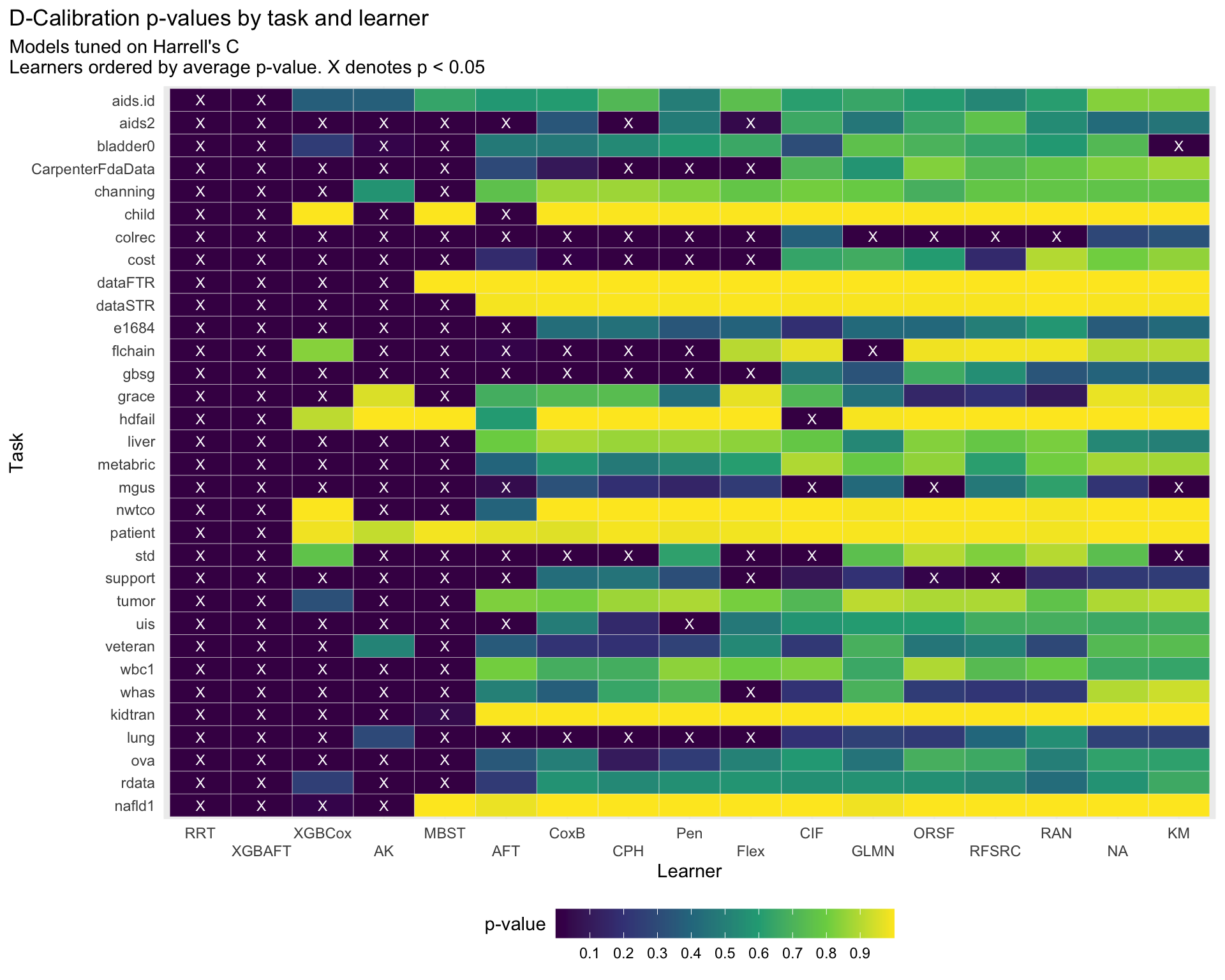 for (tuned_on inc("harrell_c", "rcll")) { p = aggr_scores |> dplyr::filter(tuned == tuned_on) |> dplyr::mutate(dcalib_p =pchisq(dcalib, 10-1, lower.tail =FALSE),dcalib_label =fifelse(dcalib_p <0.05, "X", "") ) |>ggplot(aes(x = forcats::fct_reorder(learner_id, dcalib_p), y = forcats::fct_rev(task_id), fill = dcalib_p) ) +geom_tile(color ="#EEEEEE") +geom_text(aes(label = dcalib_label), color ="white", size =3) +# scale_fill_manual(values = c(`TRUE` = "red", `FALSE` = "blue"), labels = c(`TRUE` = "Signif.", `FALSE` = "Not Signif.")) +scale_fill_viridis_c(breaks =seq(0, 1, .1)) +guides(x =guide_axis(n.dodge =2), fill =guide_colorbar(title.vjust = .8,barwidth =unit(200, "pt") )) +labs(title ="D-Calibration p-values by task and learner",subtitle = glue::glue("Models tuned on {msr_tbl[id == tuned_on, label]}\n","Learners ordered by average p-value. X denotes p < 0.05" ),y ="Task", x ="Learner", color =NULL, fill ="p-value" ) +theme_minimal() +theme(legend.position ="bottom",plot.title.position ="plot",panel.grid.major.y =element_blank(),panel.grid.minor.y =element_blank(),panel.spacing.x =unit(5, "mm"),panel.background =element_rect(fill ="#EEEEEE", color ="#EEEEEE") )print(p)}